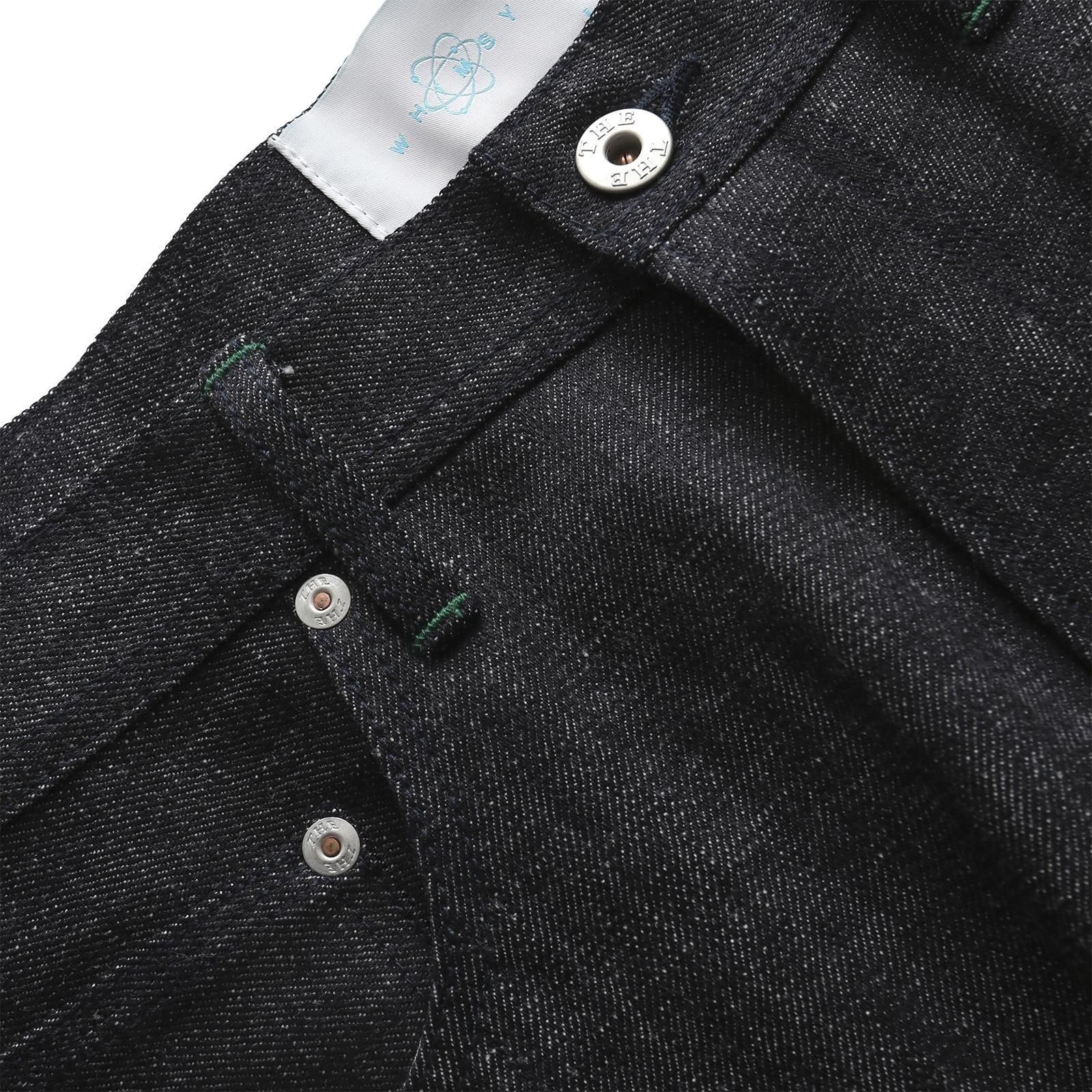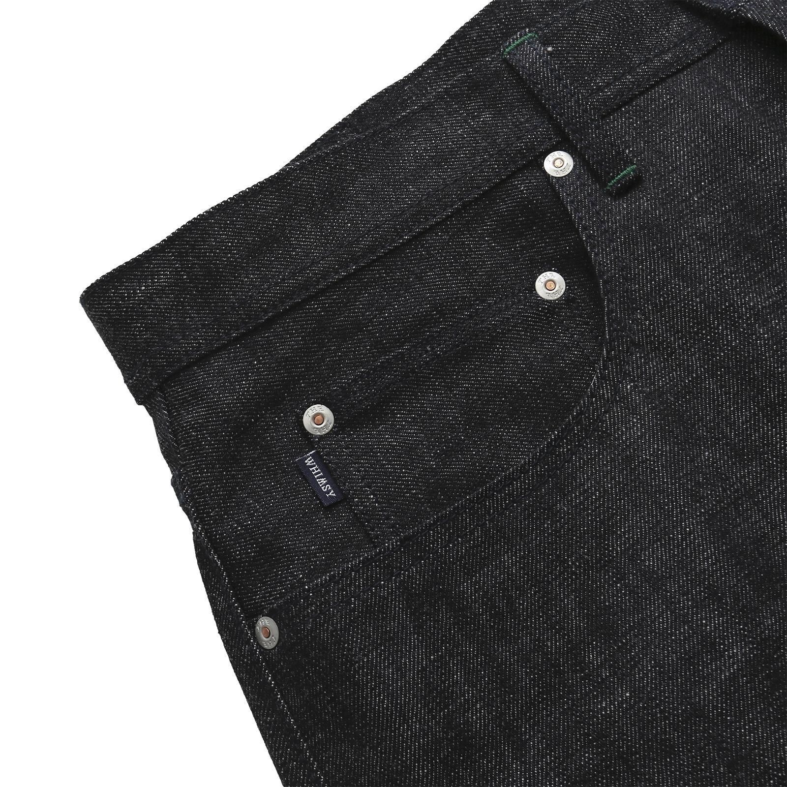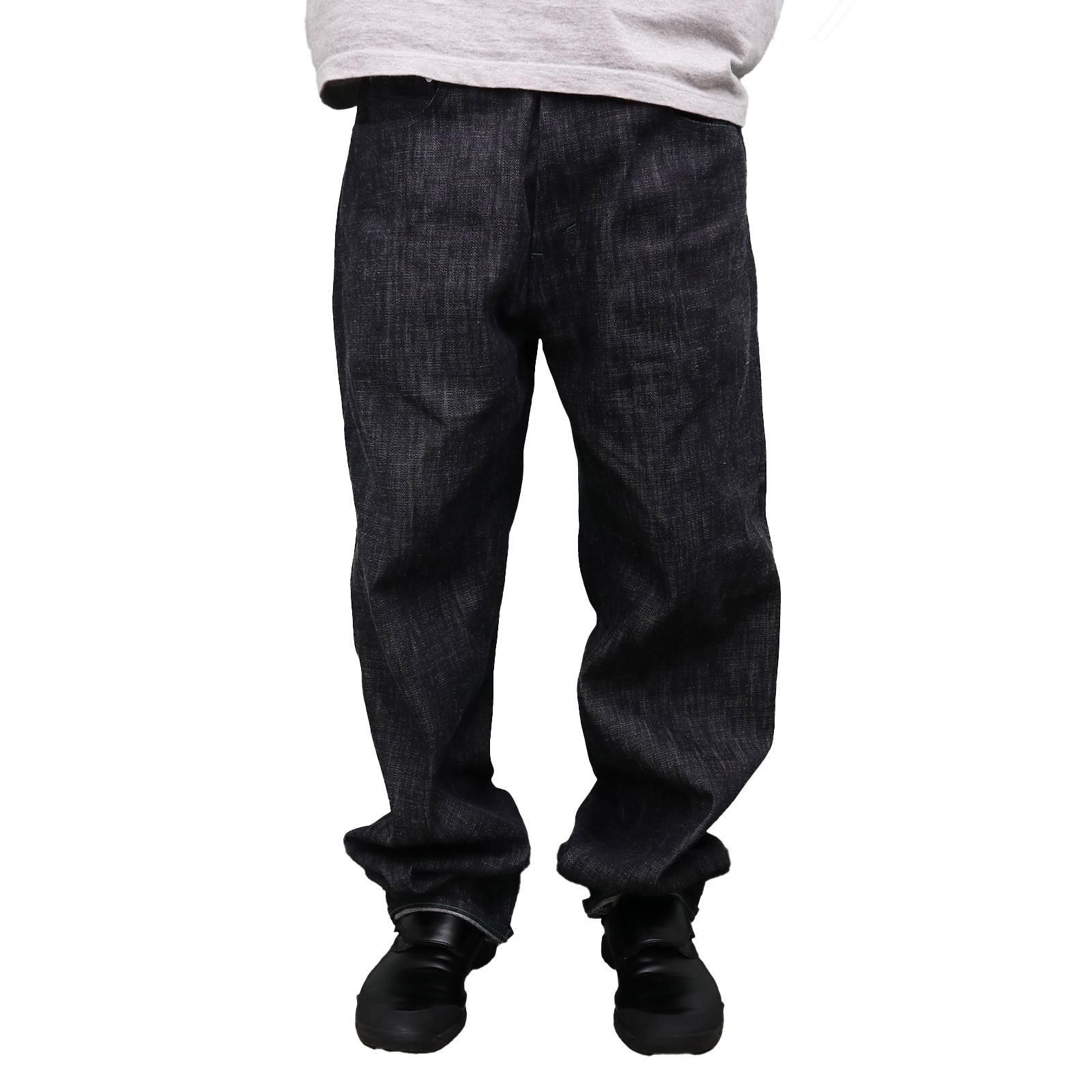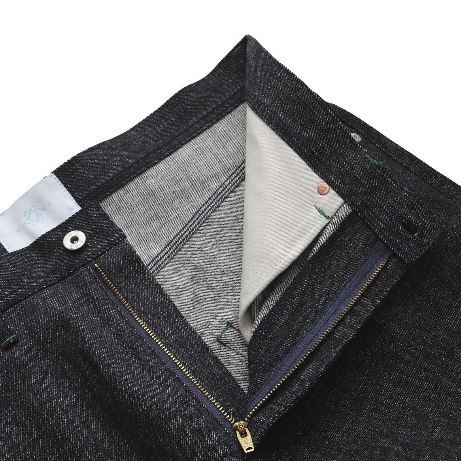 チャックテイラーのようなスニーカーにバギーシルエットのパンツを合わせた時にパンツが地面に擦れることを避ける為に裾を手縫いで絞る事を思いついた。それによりテーパードをしたパンツには出せないシルエットを実現した。生産はTHE UNIONメイド。彼らのクラフトマンシップによって風格あるWHIMSYのデニムが完成。