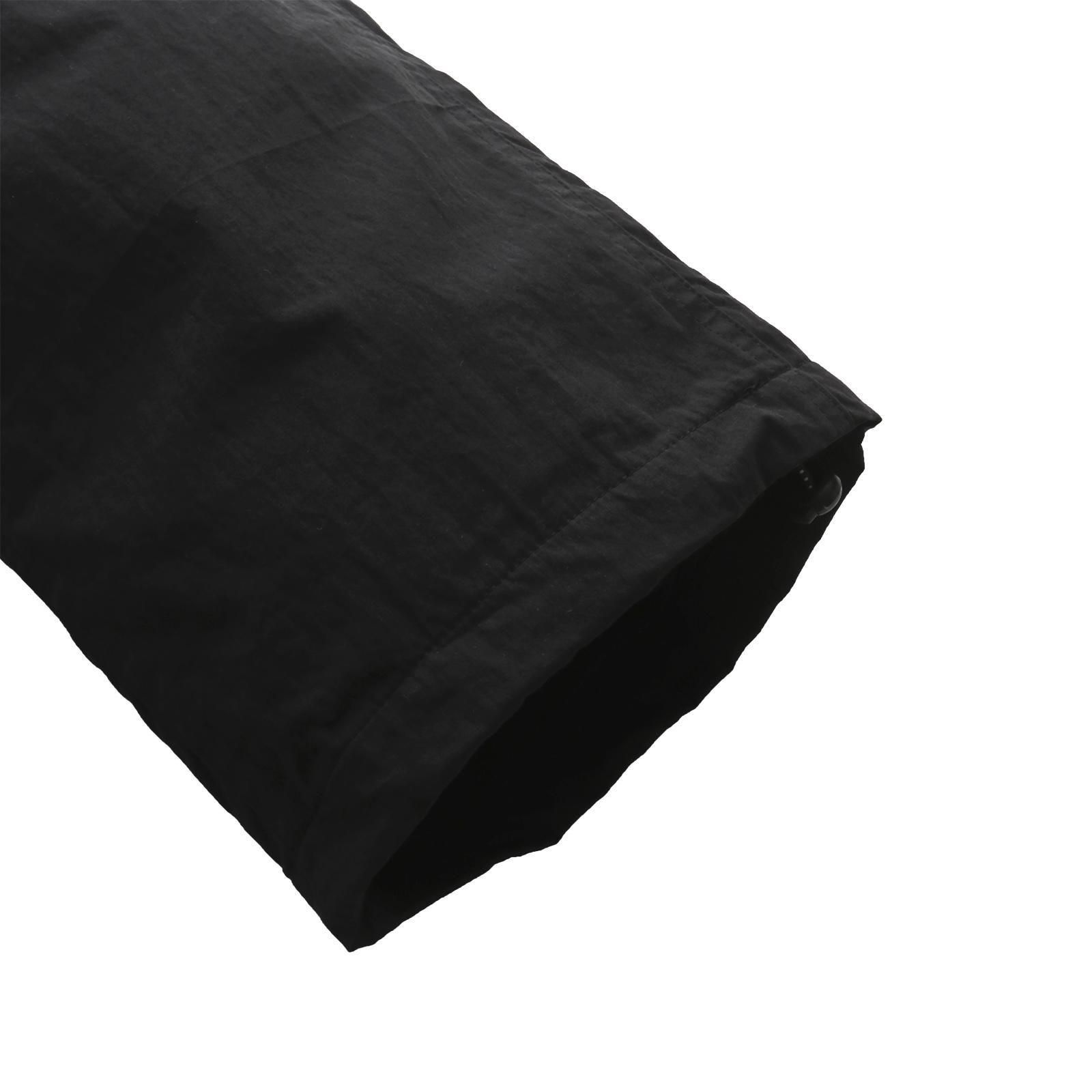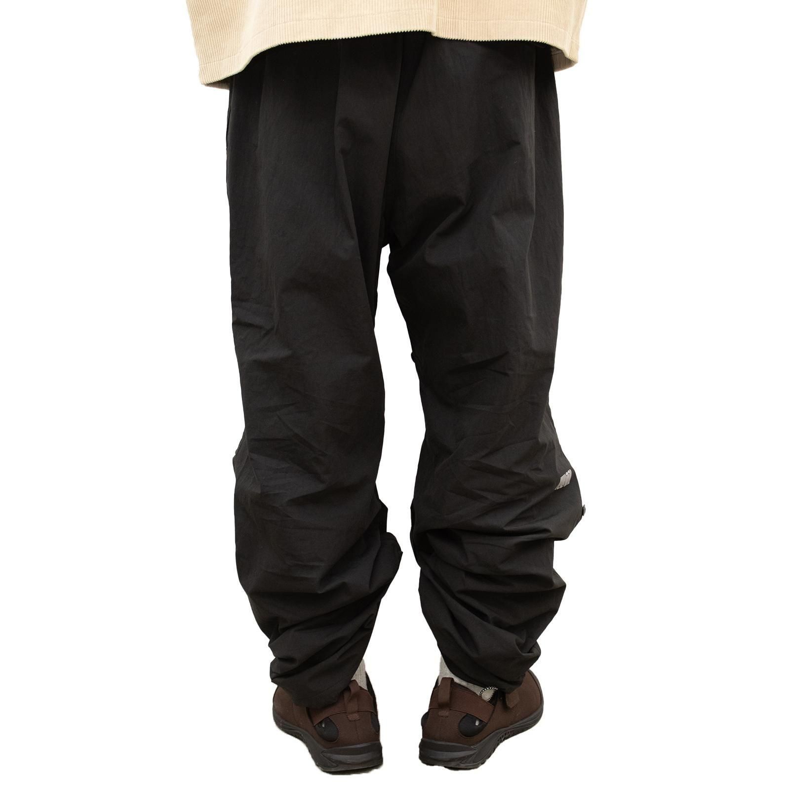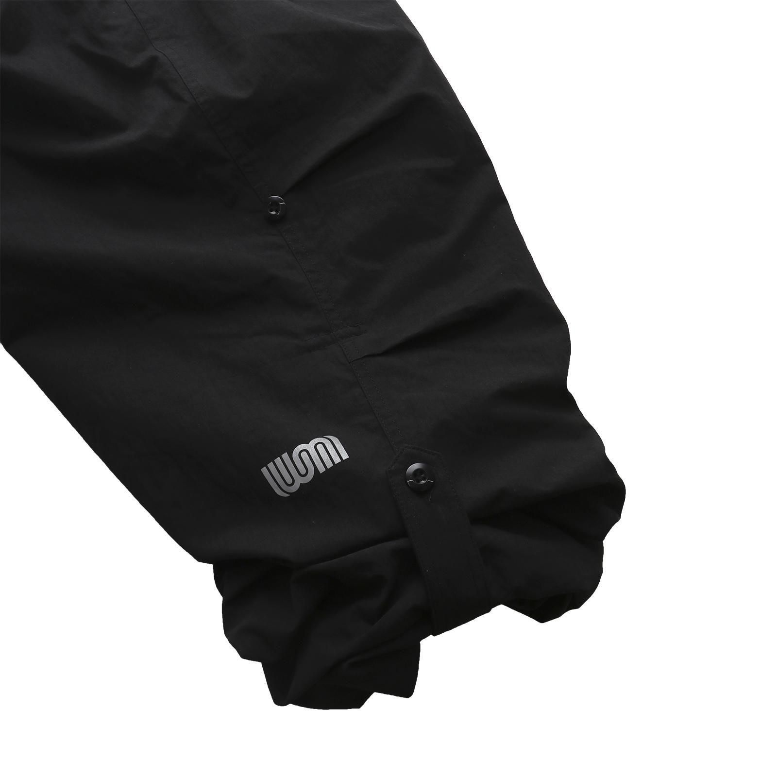 膝裏のリフレクター、そして内部に備え付けられたベルトを フロントに配置されたボタンと装着する事で丈感を調節出来るなどギミックが搭載されたナイロンパンツとなっている。