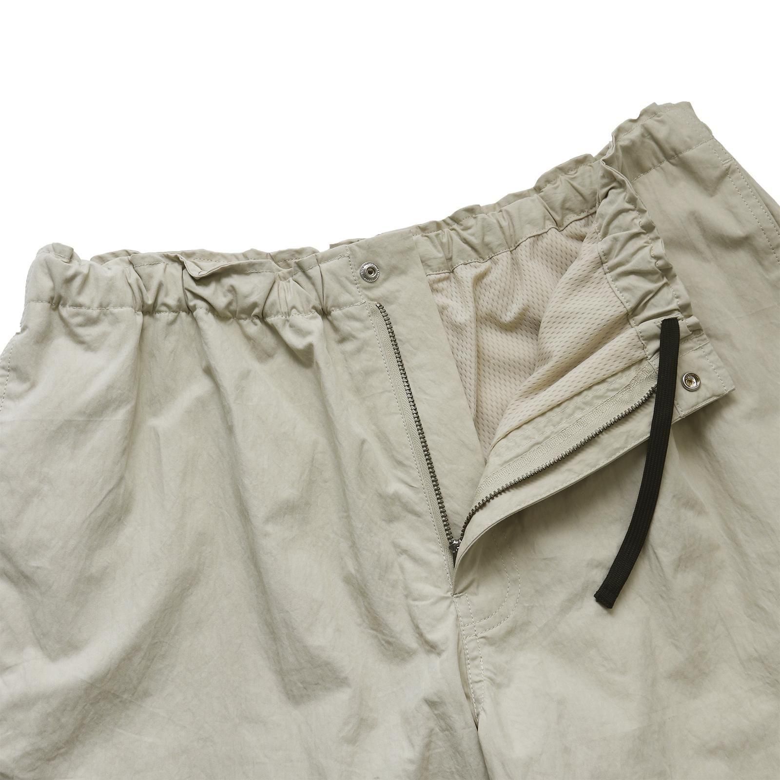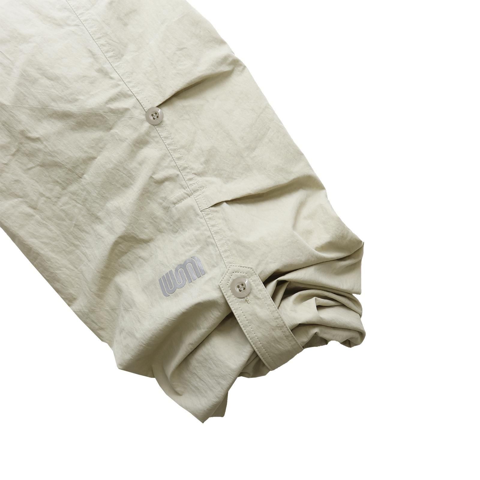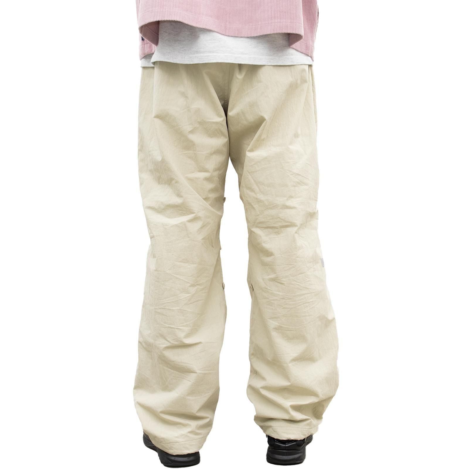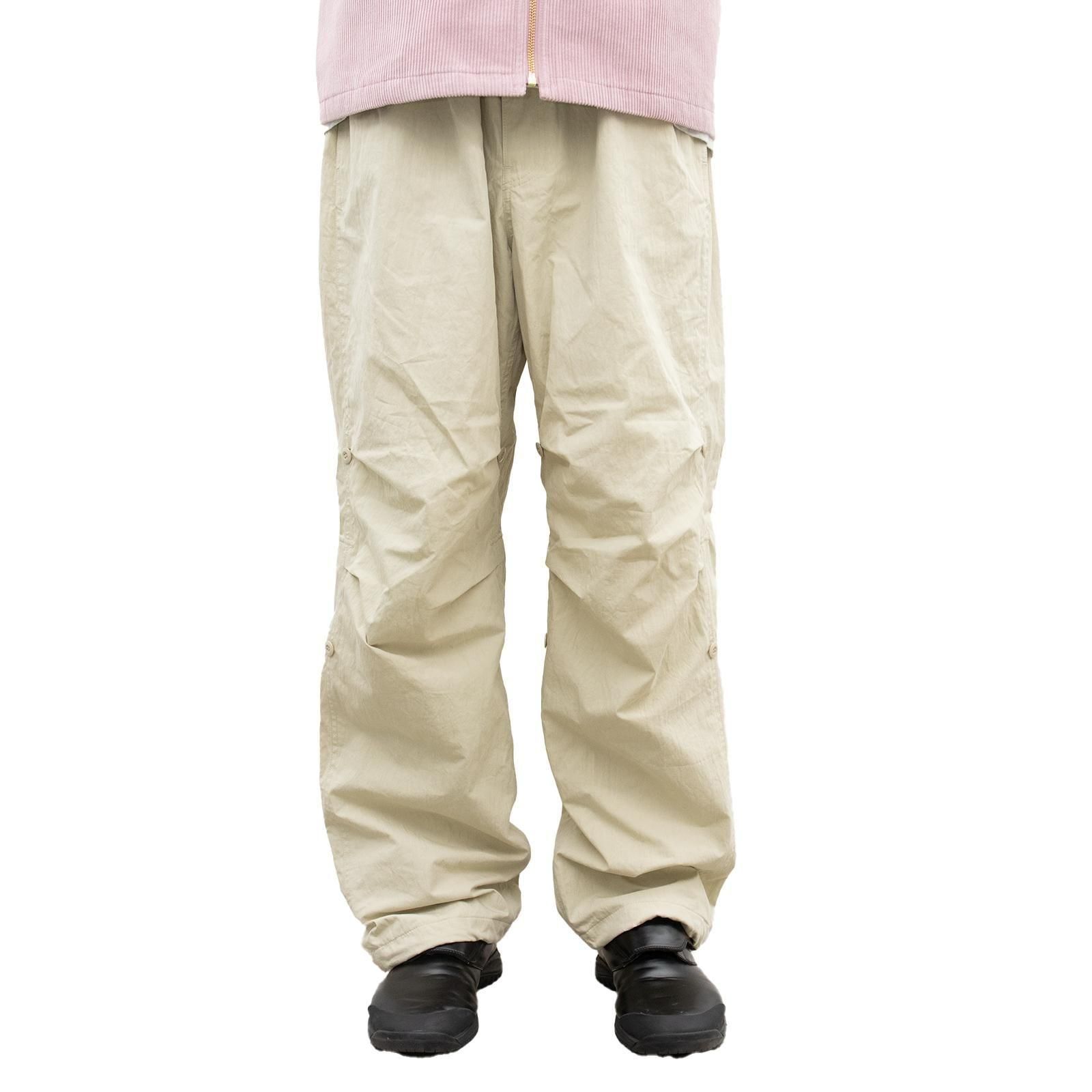 フロントに配置されたボタンと装着する事で丈感を調節出来るなどギミックが搭載されたナイロンパンツとなっている。