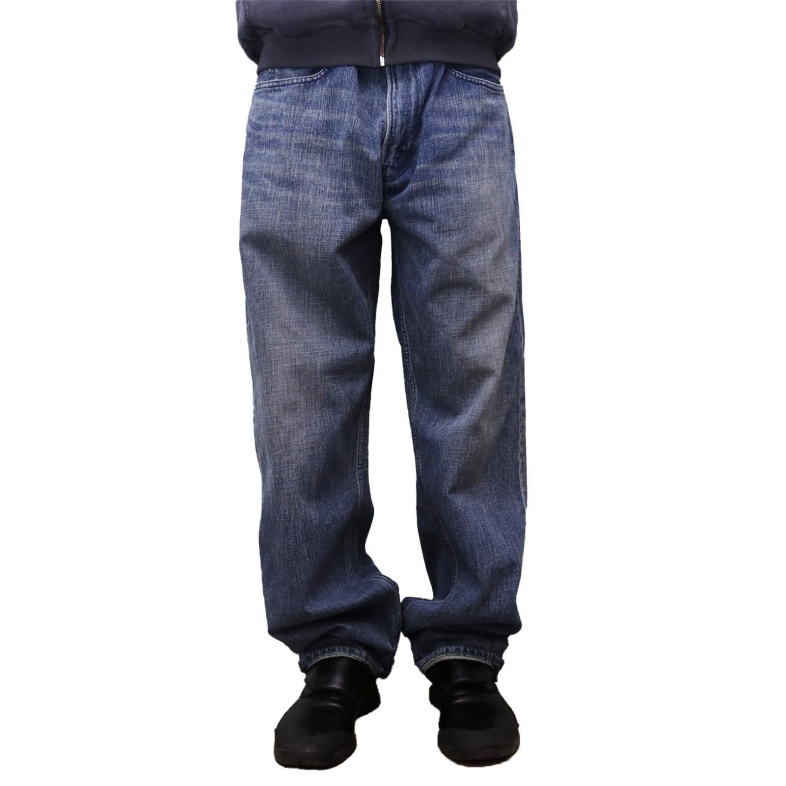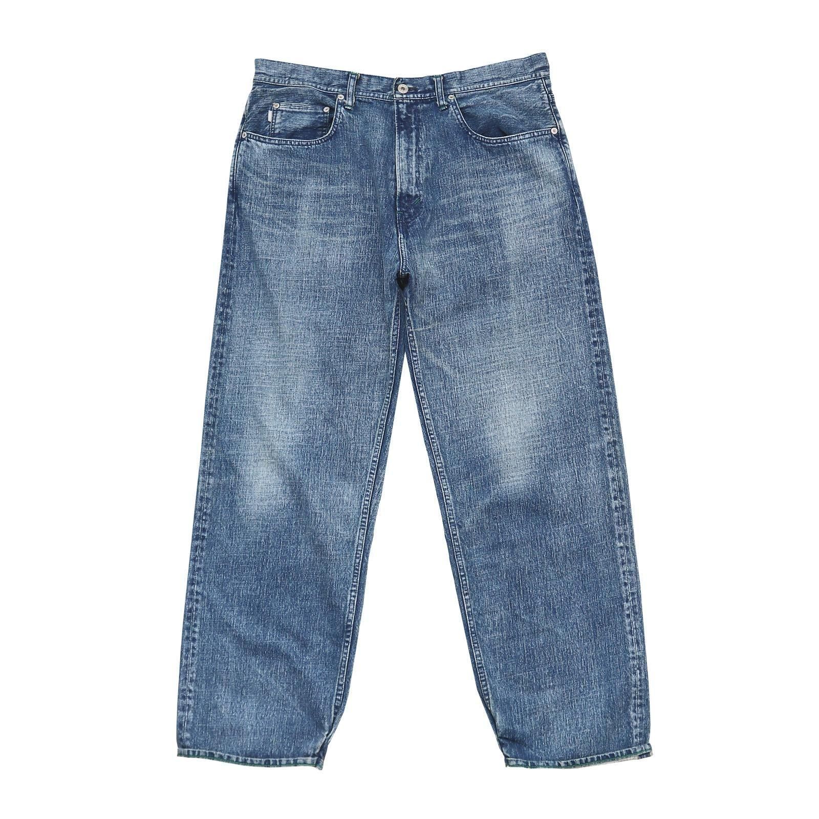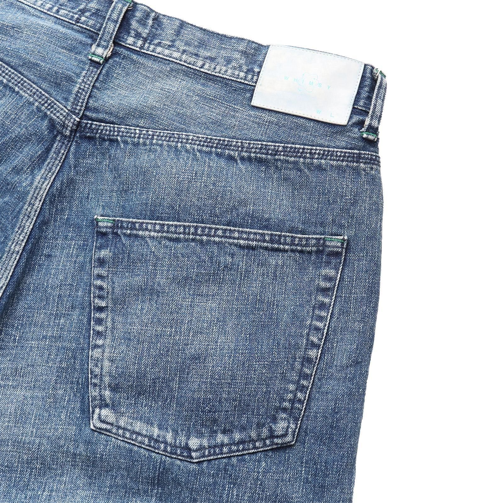 チャックテイラーのようなスニーカーにバギーシルエットのパンツを合わせた時にパンツが地面に擦れることを避ける為に裾を手縫いで絞る事を思いついた。それによりテーパードをしたパンツには出せないシルエットを実現した。生産はTHE UNIONメイド。彼らのクラフトマンシップによって風格あるWHIMSYのデニムが完成。