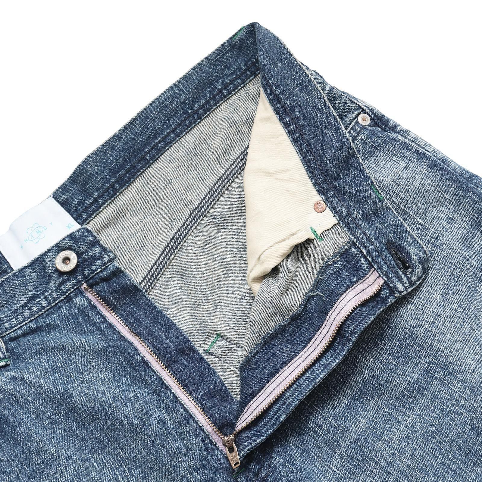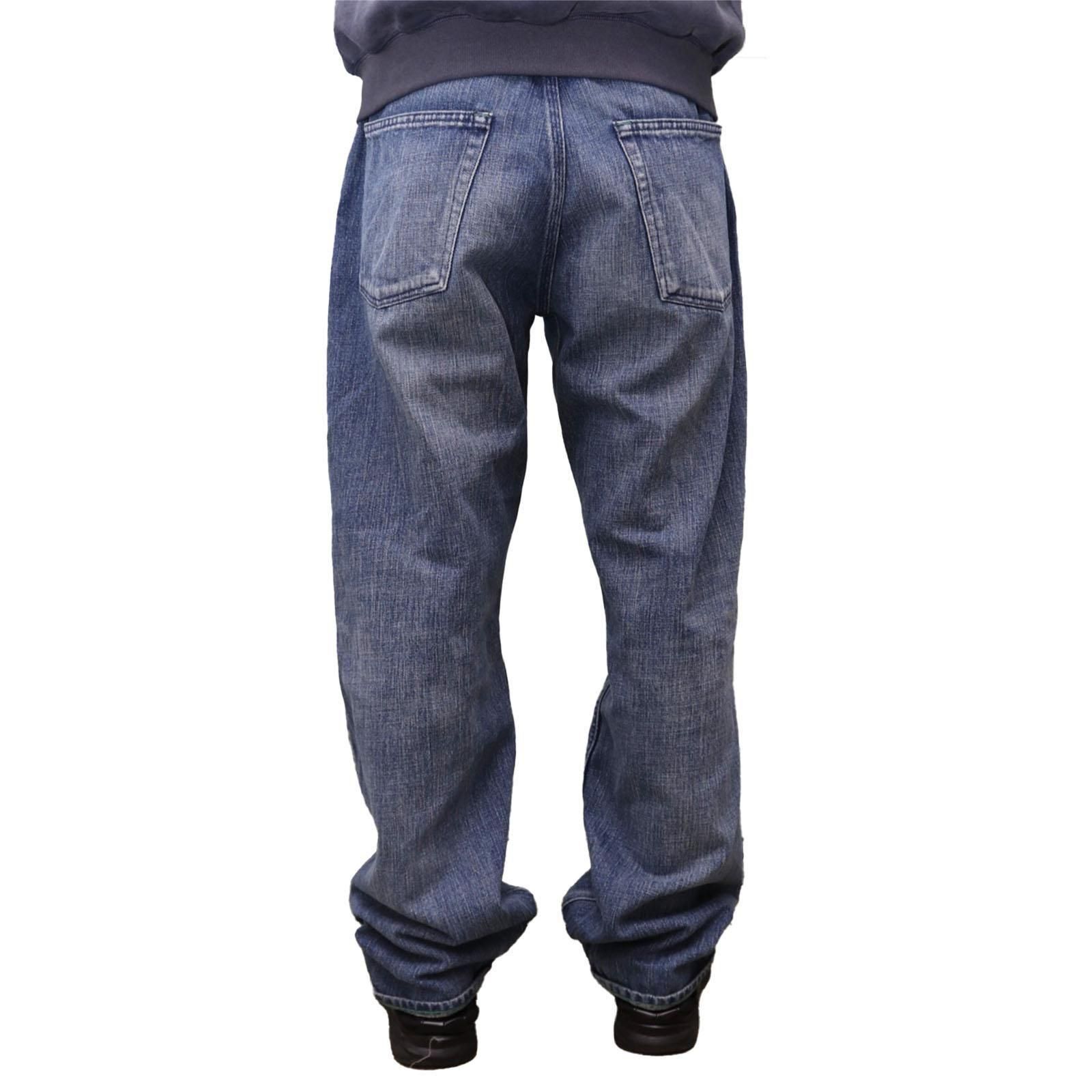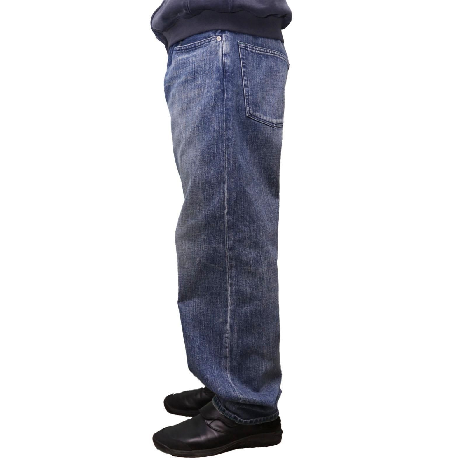 チャックテイラーのようなスニーカーにバギーシルエットのパンツを合わせた時にパンツが地面に擦れることを避ける為に裾を手縫いで絞る事を思いついた。それによりテーパードをしたパンツには出せないシルエットを実現した。生産はTHE UNIONメイド。彼らのクラフトマンシップによって風格あるWHIMSYのデニムが完成。